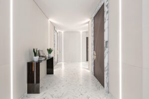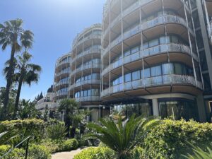 One Monte-Carlo is located within Monaco’s Carré d’Or and represents one of the Principality’s most prominent recent developments. Completed in 2019, the project comprises seven residential buildings with curved glass façades overlooking the Mediterranean. The development includes 37 high-end apartments, ranging from two-room residences to a six-room triplex featuring a private rooftop terrace and pool.