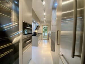 The living areas incorporate a lounge with gas fire, and a gorgeously furnished dining room that opens onto a large, private terrace with a pergola and garden area. The kitchen is separate and has direct access to the terrace, dining room and a discreet staff/delivery entrance. The appliances are state of the art.